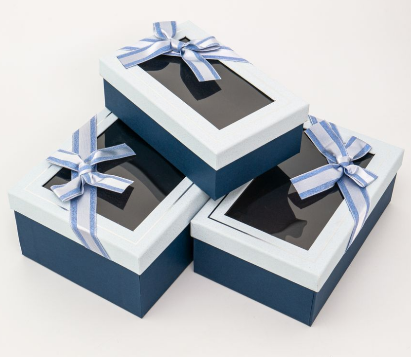 / Набор коробок 3в1 прямоугольник 23x16x9,5 / 21х14х8 / 19х12х6,5см, с бантом, окном, синий