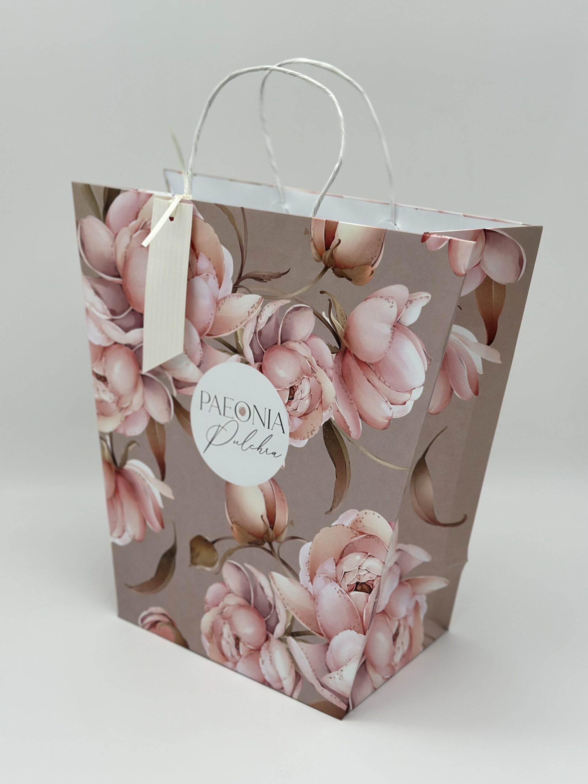 Пакет подарочный ТА 335*328мм. Трапеция. Розовые пионы на бежевом