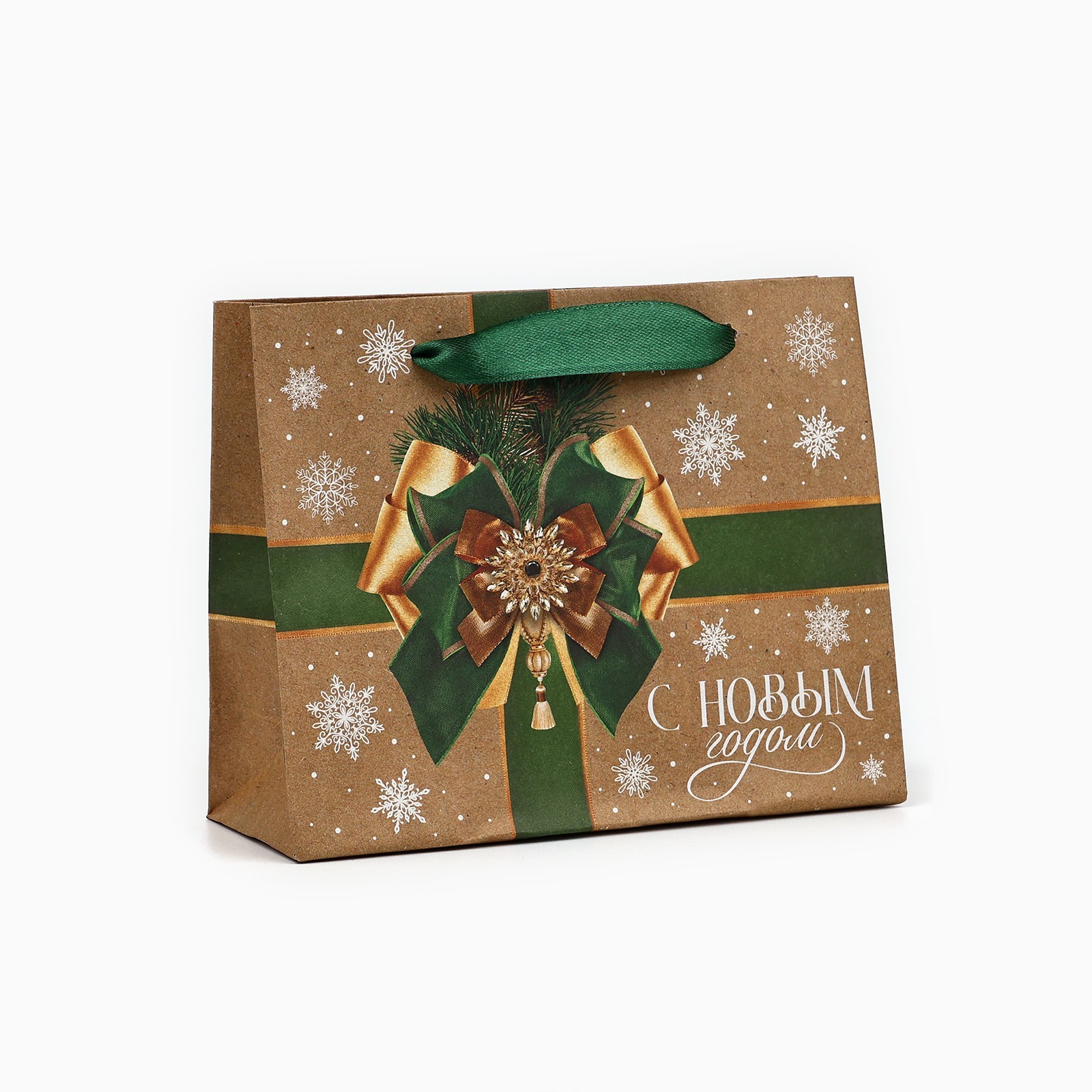 / Пакет подарочный новогодний крафтовый вертикальный «Новогодний бант», S 15 х 12 х 5.5 см , Новый год