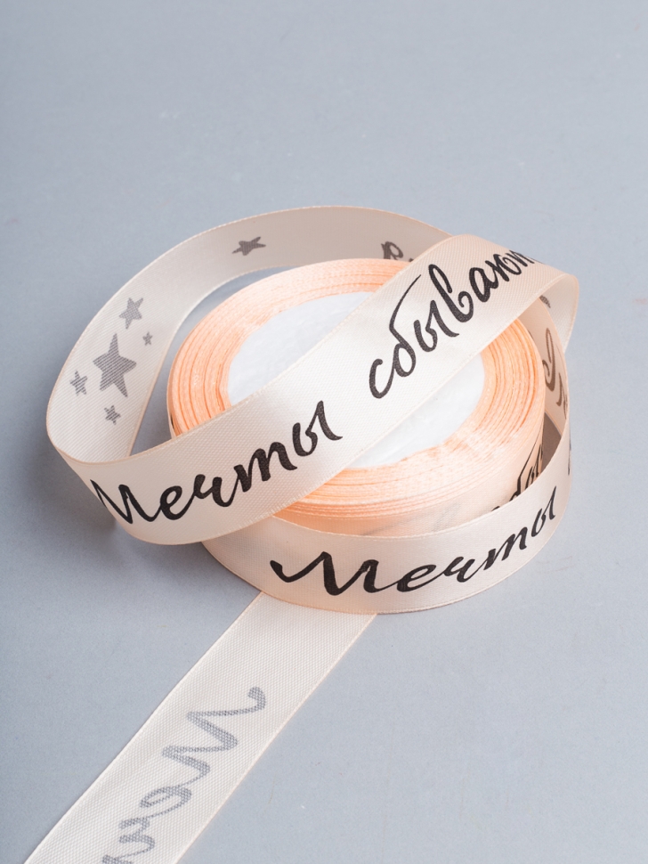 / Лента атласная 25мм х 25 ярд надпись Мечты сбываются персик