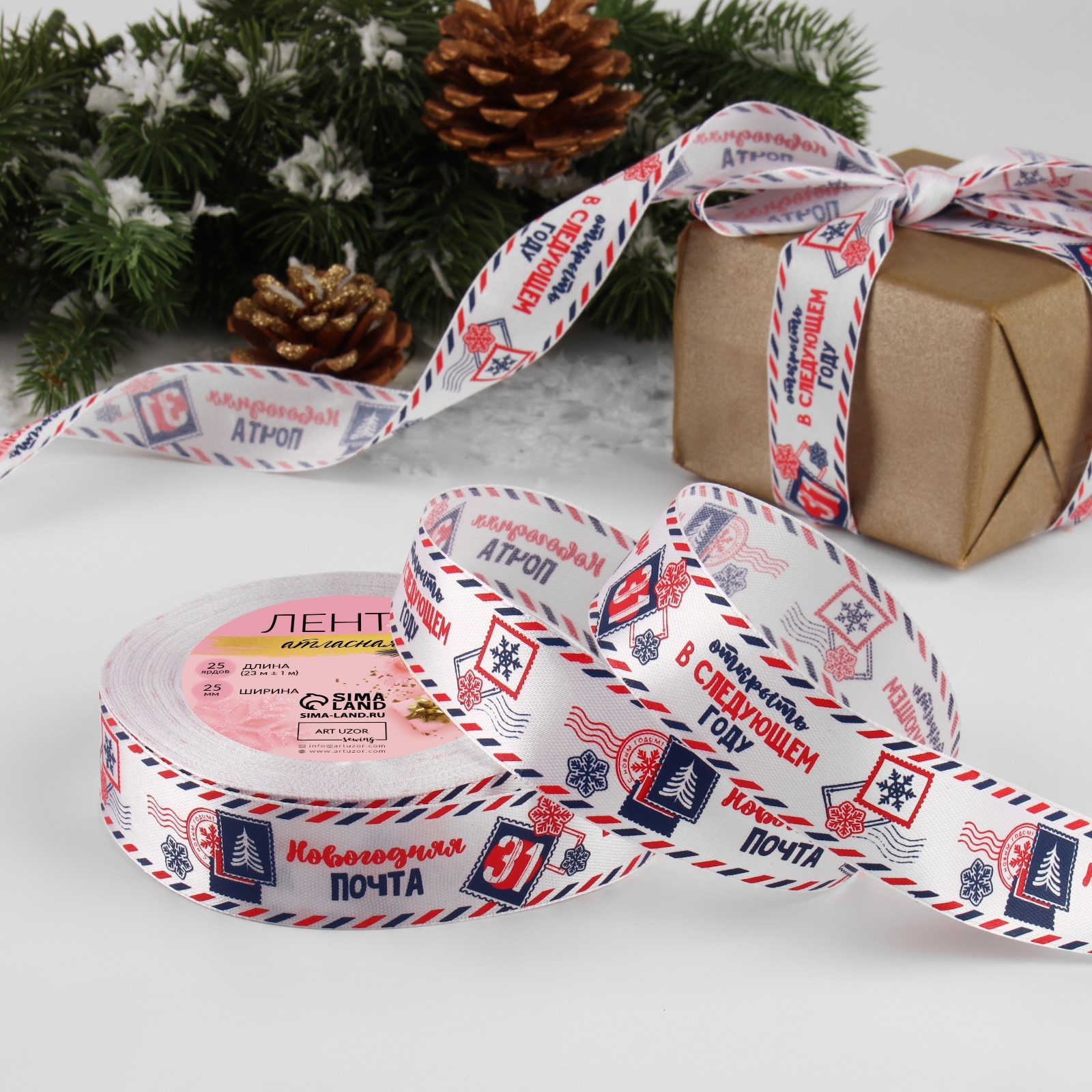 Лента атласная «Новогодняя почта», 25 мм, 23±1 м, белая