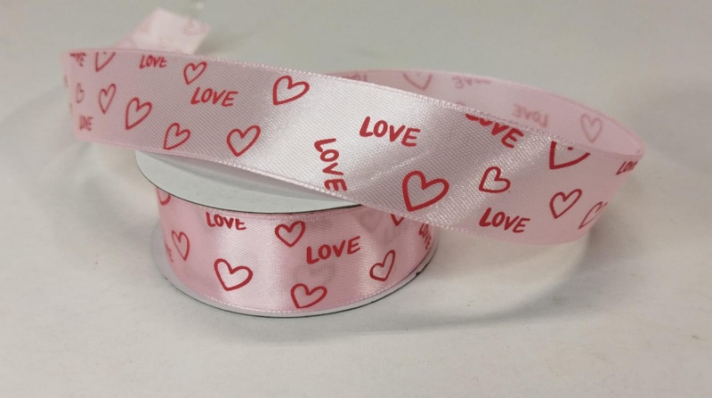 / Лента атласная с принтом “Love”, 25mmх25yards, цв. светло-розовый с винным