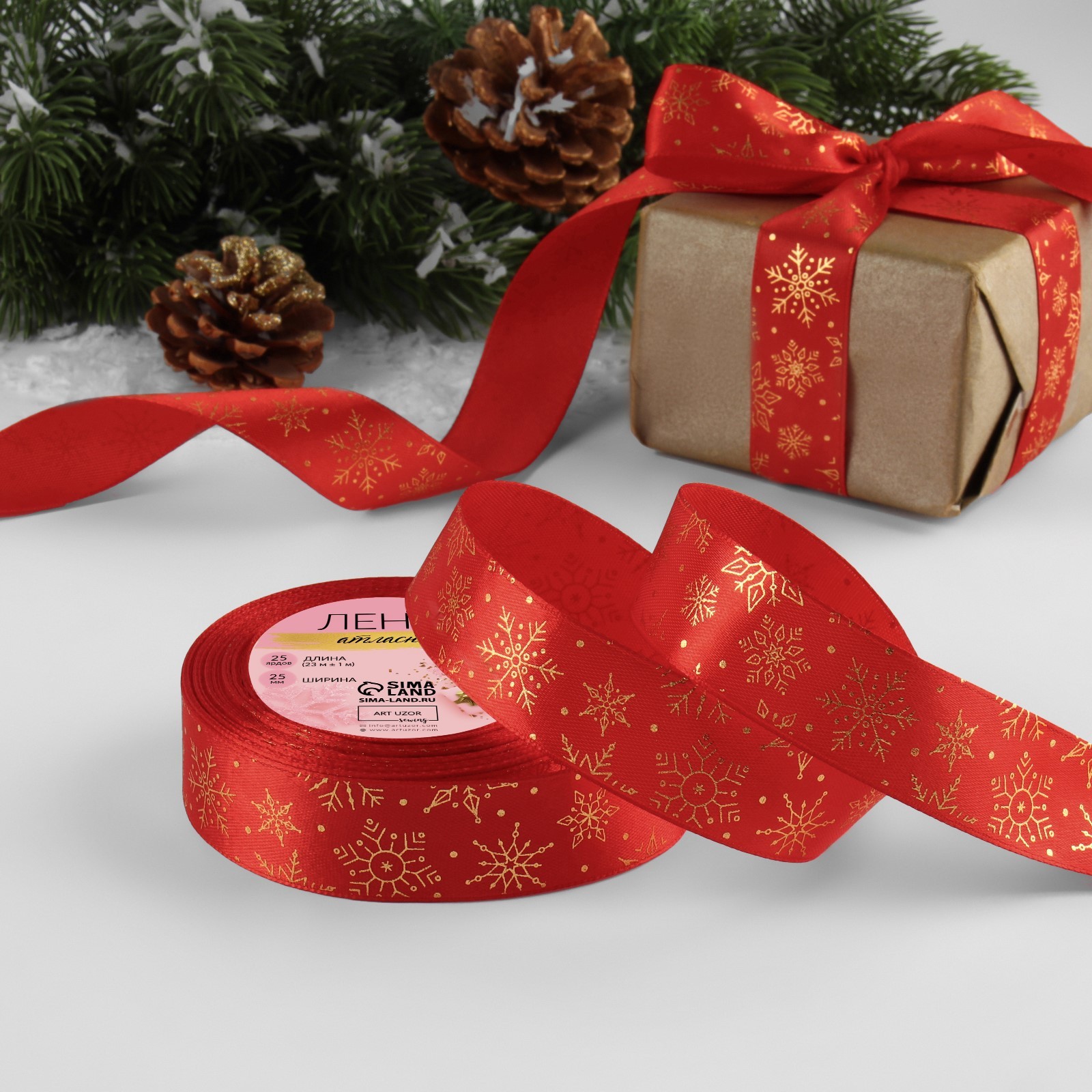 / Лента атласная с тиснением «Снежинки», 25 мм, 23±1 м, красная