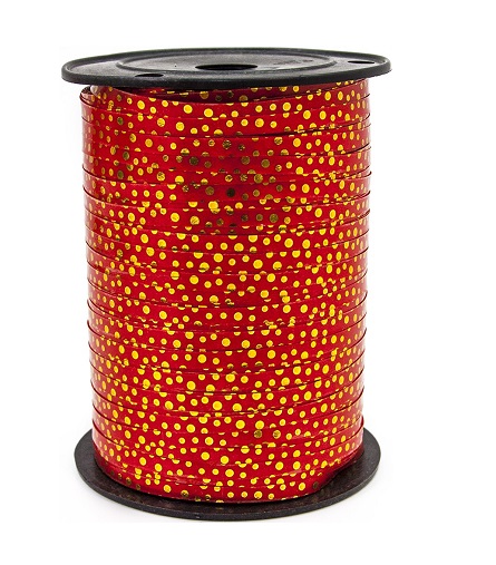 Лента на бобине с золотой полосой 0,5см*250ярд., горошек золото КРАСНЫЙ А0552