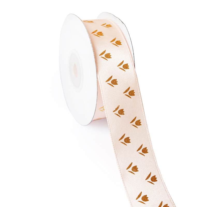 Лента Атлас с цветами Светло-персиковый / 25 мм * 22,85 м