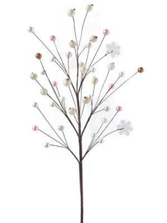 / Ветка декоративная с бусинами и цветочками, 47 см, 1 шт., белый/розовый