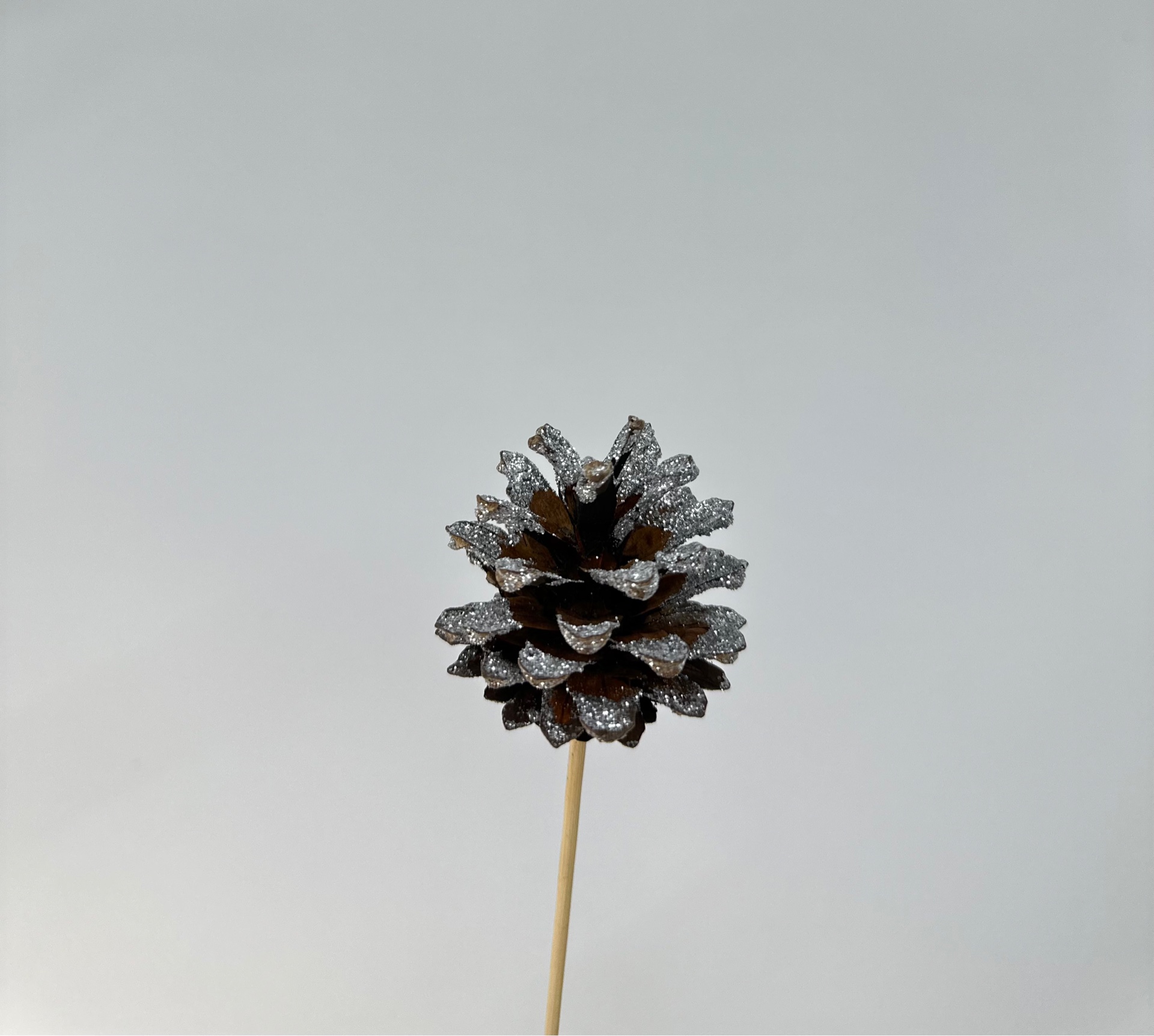 Шишка сосновая на вставке с глиттером, крупная 5*40см, 1шт/уп, серебро