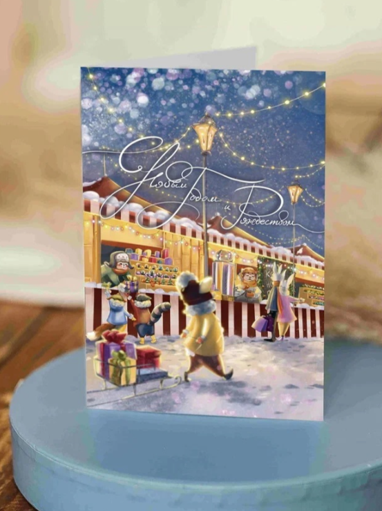 Количество товара Дизайнерская открытка "С Новым Годом и Рождеством" (ярмарка) Ar96 Лен (цена за 5 штук)
