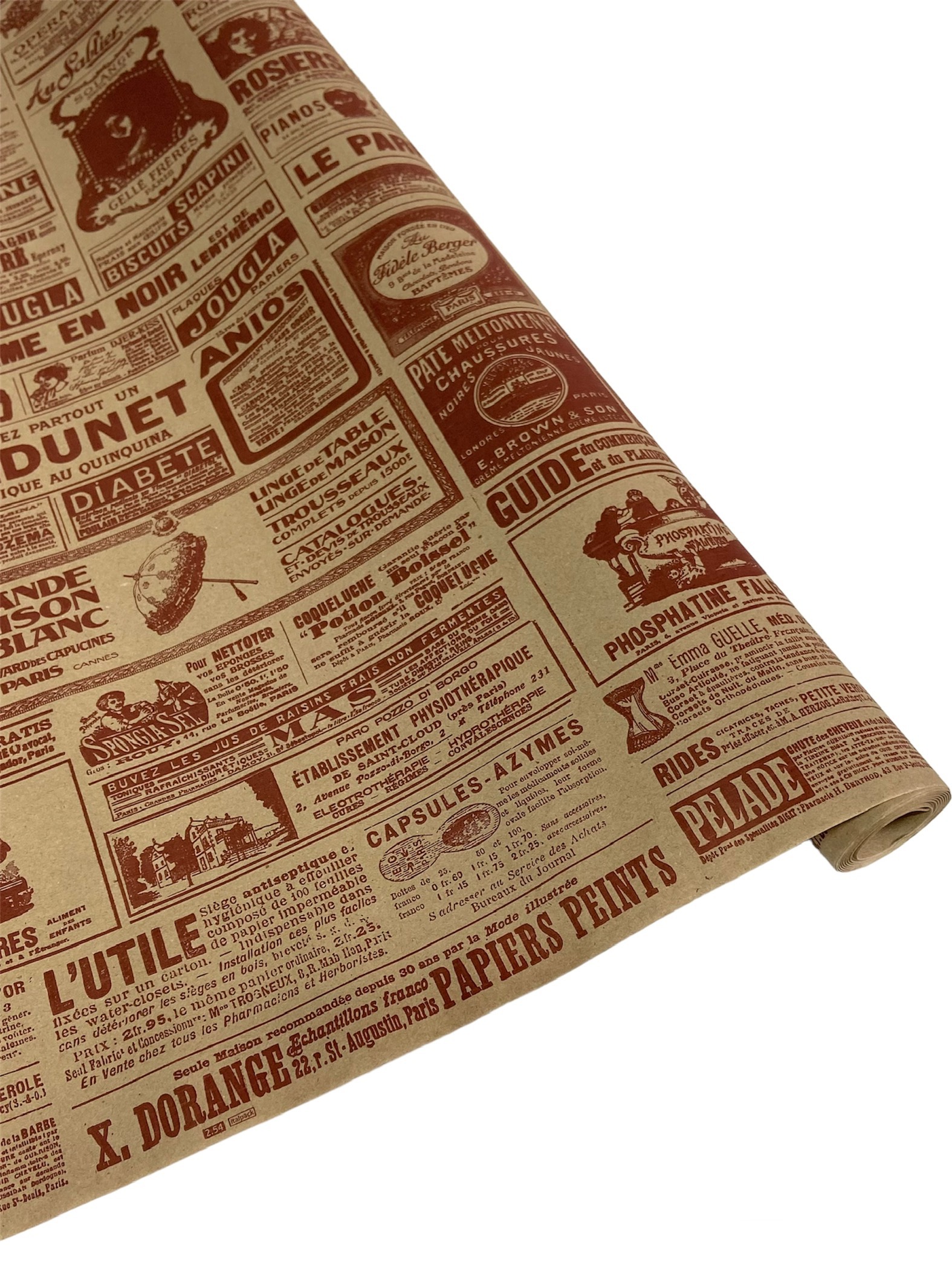 / Флористическая крафт бумага “Винтажная газета”, 70 см x 10 ярд, бурый / бордовый