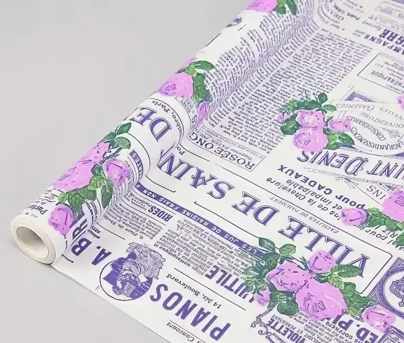 Флористическая крафт бумага “Кутюрье”, 70 см x 10 ярд, белый / фиолетовый-сиреневый-зеленый