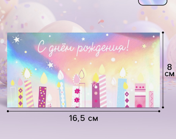 Количество товара Конверт для денег «С днём рождения», голография, торт, 16.5×8 см