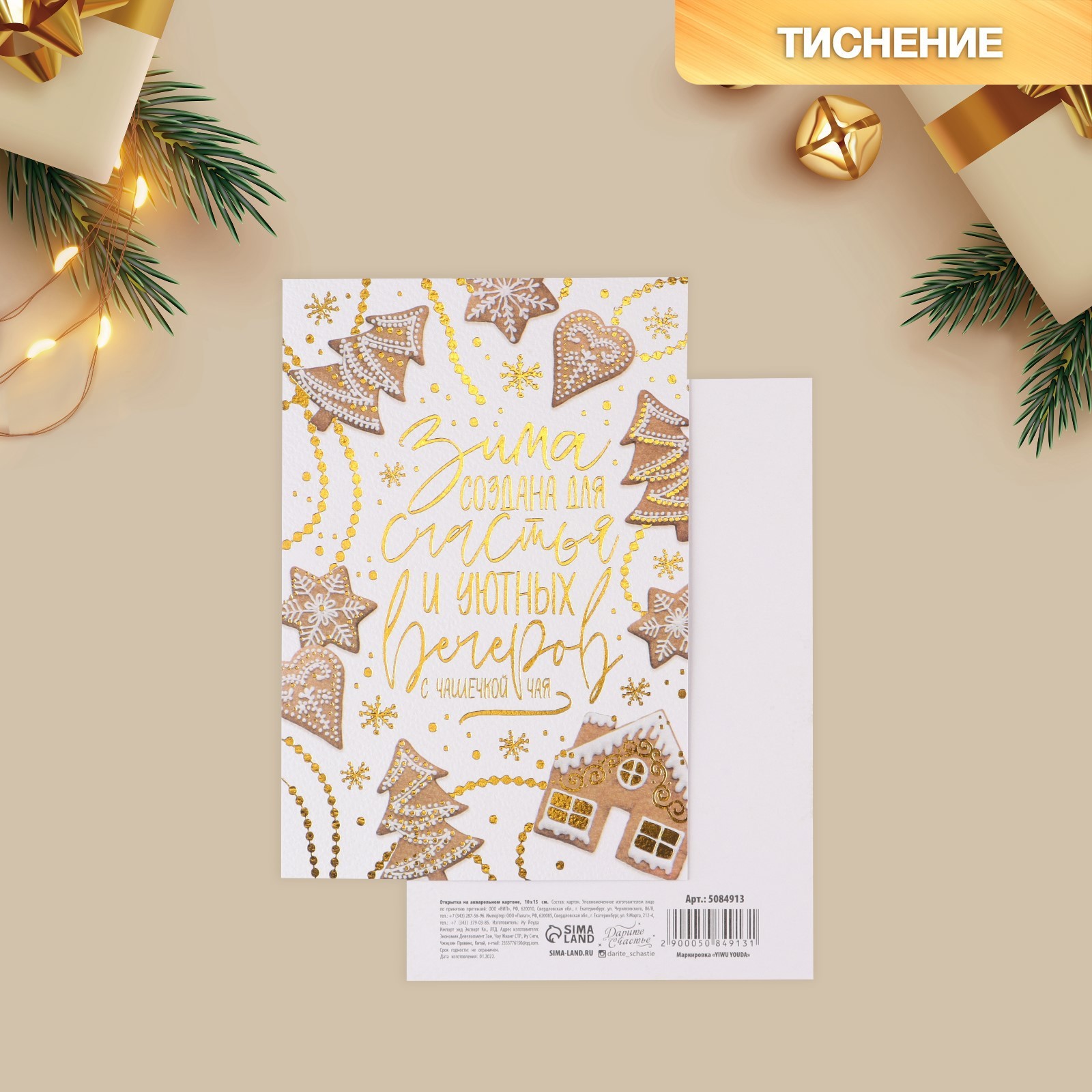 / Открытка с новым годом на акварельном картоне «Имбирное печенье», тиснение, 10 х 15 см, Новый год