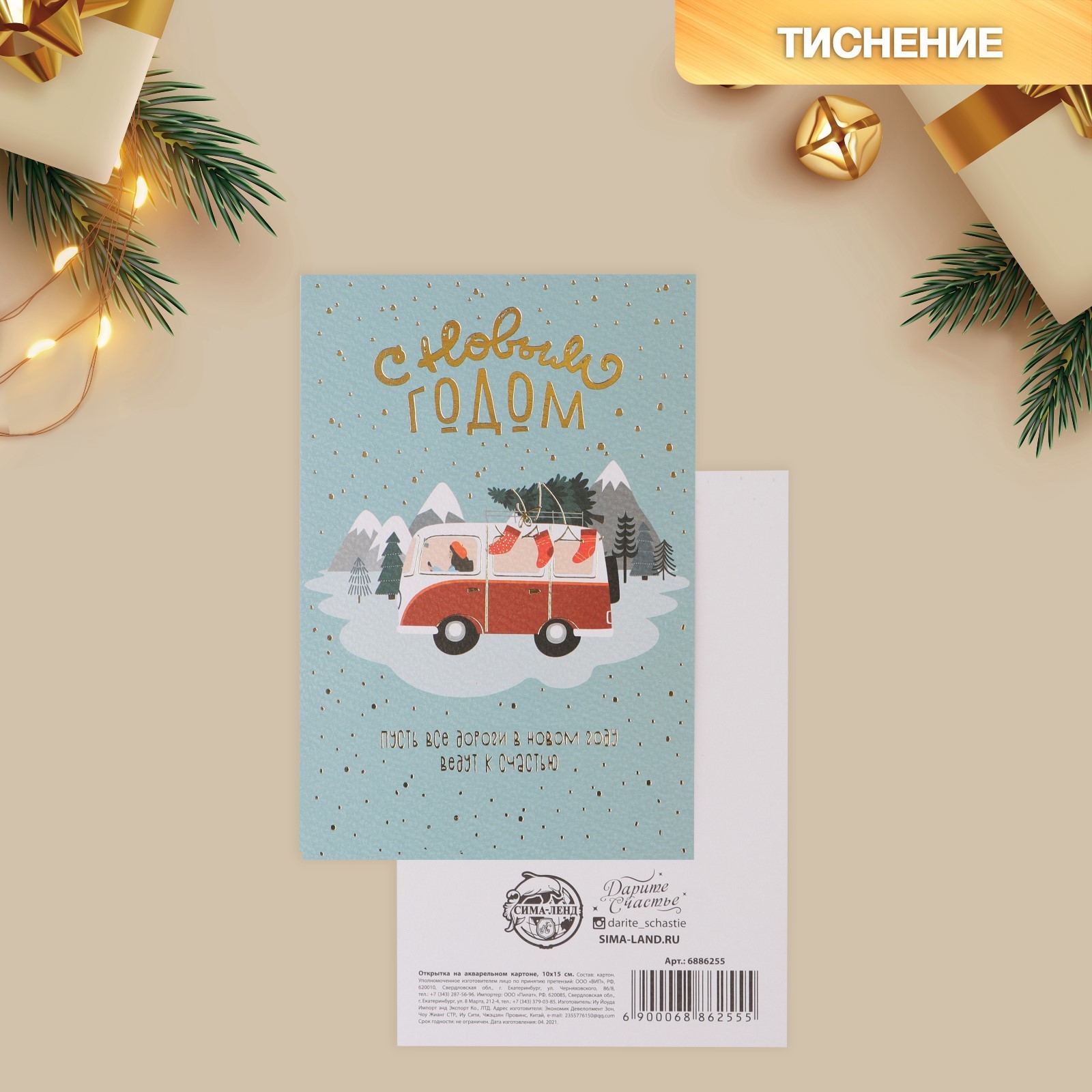 / Открытка с новым годом на акварельном картоне «Дороги к счастью», тиснение, 10 х 15 см, Новый год