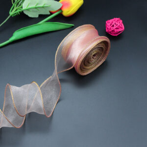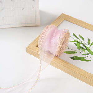 Лента декоративная (4 см*9,14 м) Органза с леской, Золотая кайма, Розовый, 1 шт.