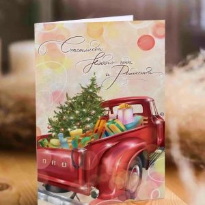 Дизайнерская открытка “Рождественский пикап” Ar92 Лен (цена за 5 штук)