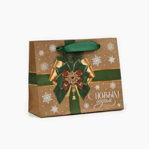 Пакет подарочный новогодний крафтовый вертикальный «Новогодний бант», S 15 х 12 х 5.5 см , Новый год
