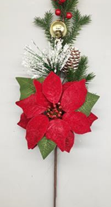 Ветка с цветком пуансеттии, красными ягодами и шишкой, 65 см